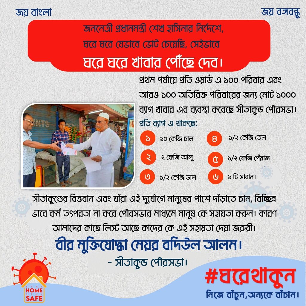 জননেত্রী শেখ হাসিনার নির্দেশে ঘরে ঘরে যেভাবে ভোট চেয়েছি : সেভাবে ঘরে ঘরে খাবার পৌঁছে দেবো। মেয়র বীরমুক্তিযোদ্ধা বদিউল আলম